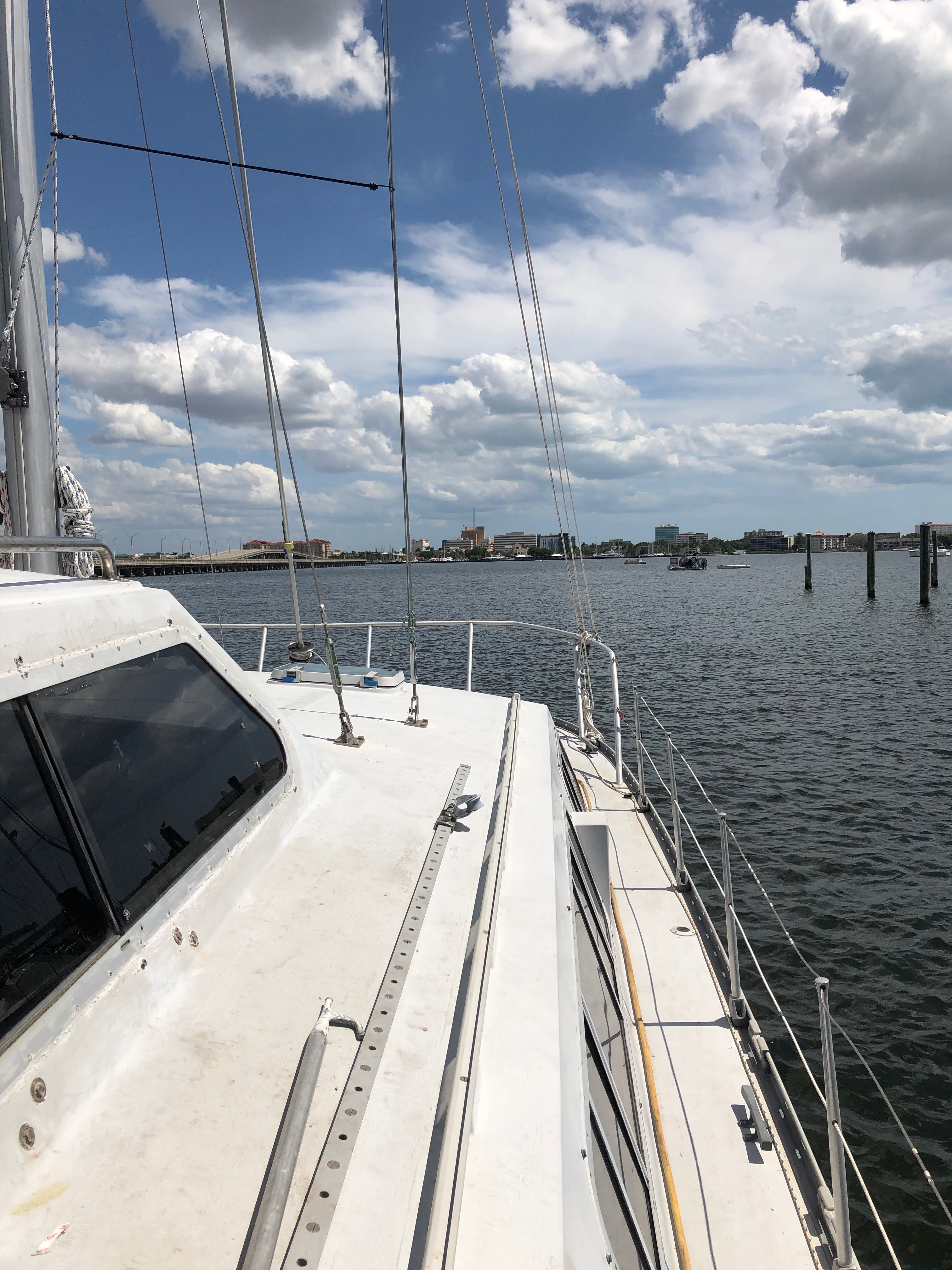 By the time assessments of collateral damage had been performed and all necessary repairs had been attended, it was dusk and we currently had no desire to travel anywhere in unfamiliar waters in the dark, especially in an unfamiliar ‘new to us’ catamaran after a new repair. The bridge tender at Anna Maria was a champ; not only had they stayed in touch with us all afternoon and evening, checking in to make sure we were okay and asking if we needed anything, but also like a protective guardian they monitored our positioning and advised us that we were fine to stay the night at anchor where we were once night fell.