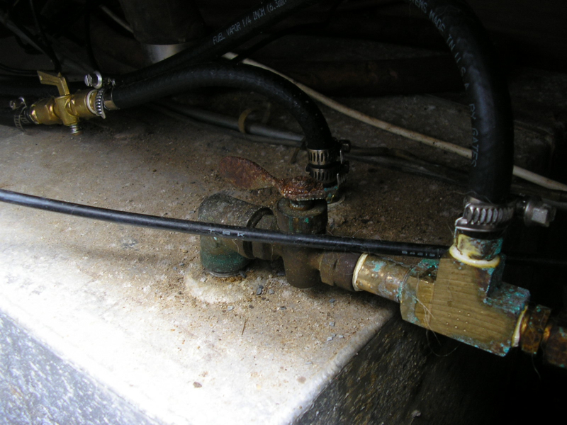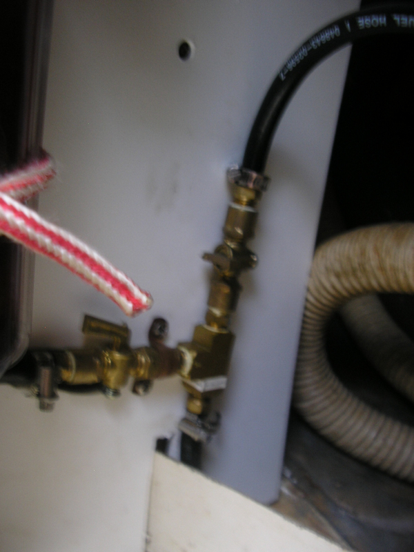 Below you can see the lines to and from the fuel tank. The one to the left is where the clean fuel goes back into the tank. This valve is shown in red on the diagram, is turned to the closed position to make the clean fuel by-pass the tank and go to the engine instead. The one to the right is where the fuel is pulled from the tank to be cleaned.